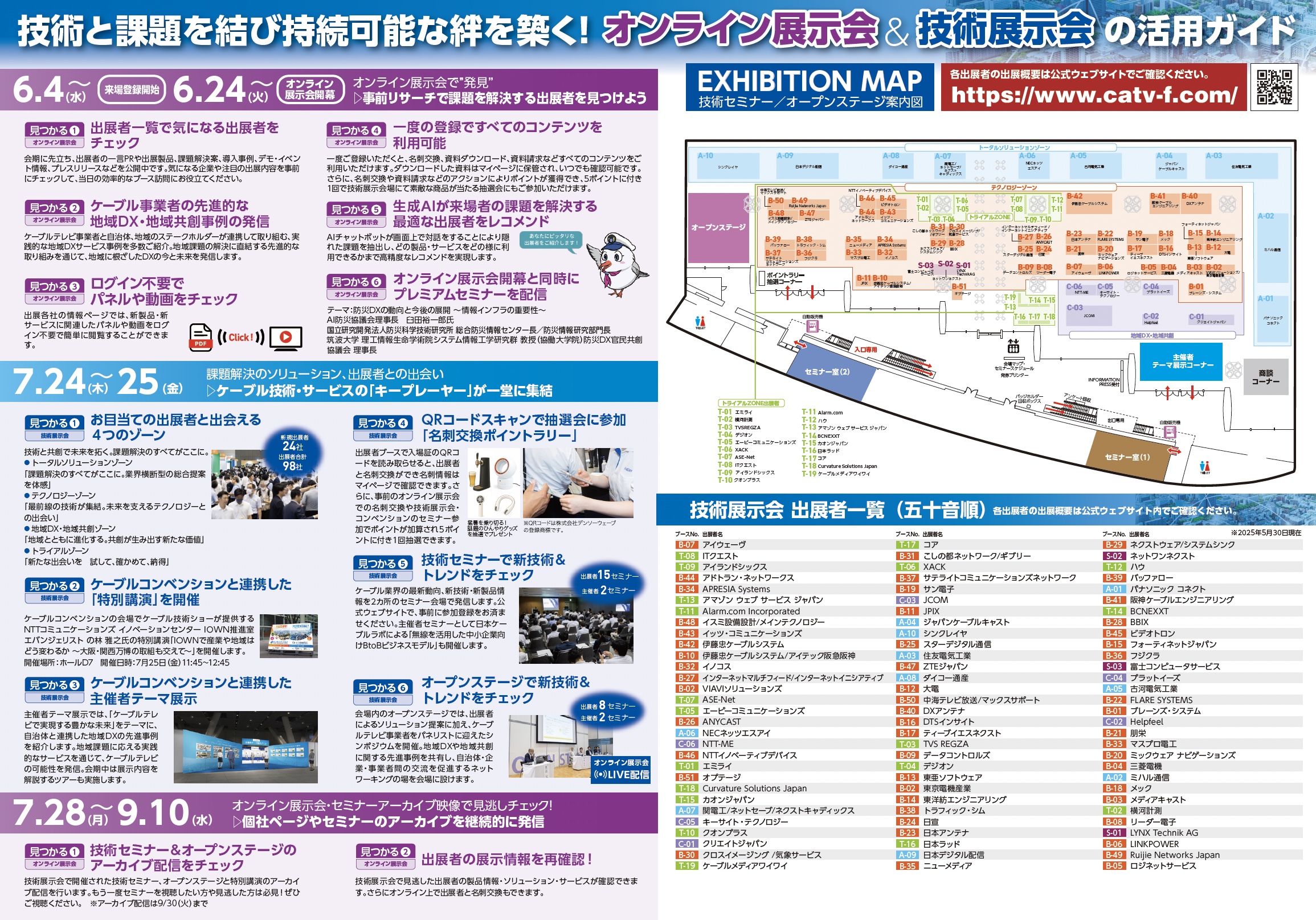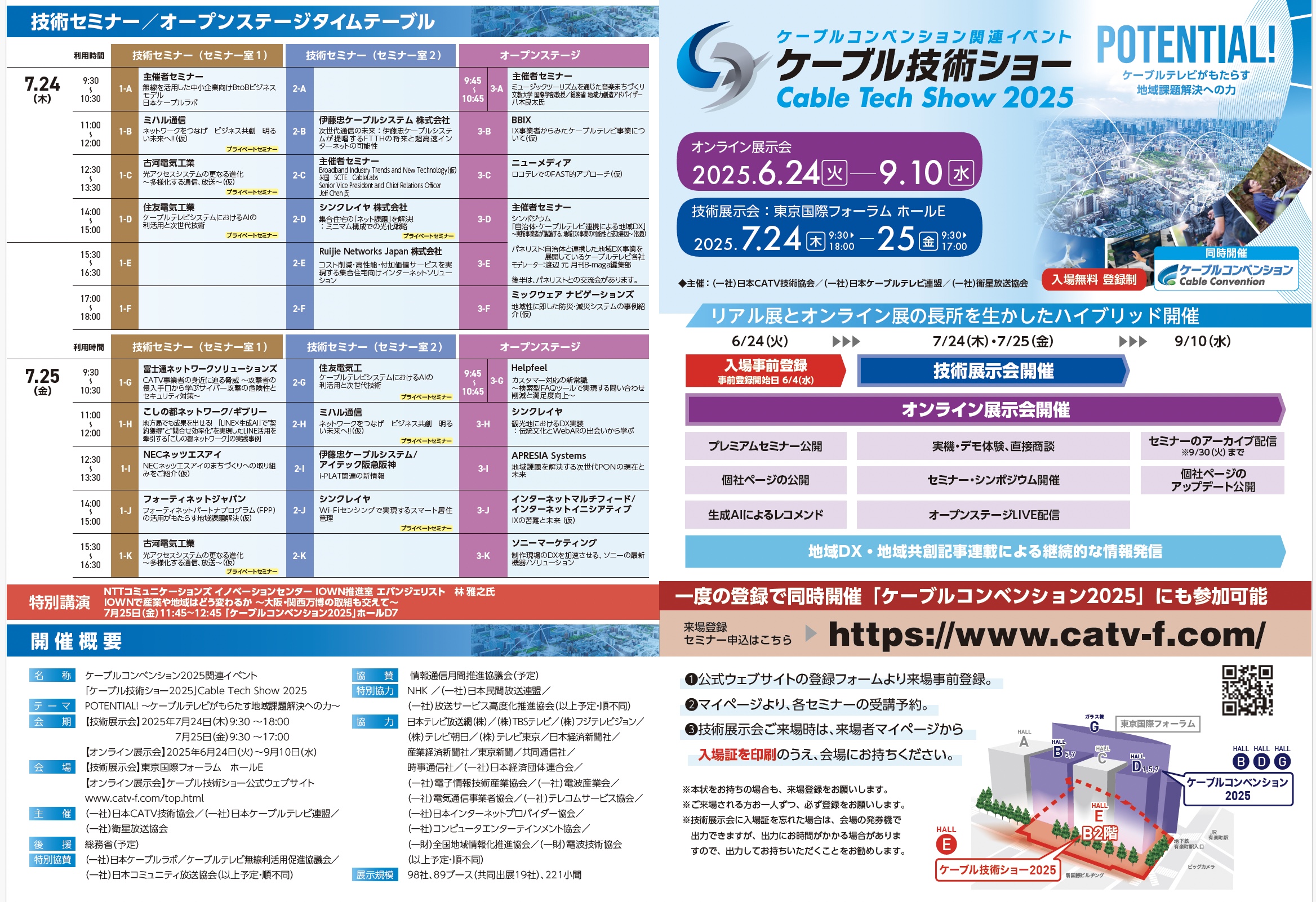 弊社では、7月24日(木)25日(金)に開催される「ケーブル技術ショー2025」において、主催者テーマ展示コーナーに出展いたします。 展示では、「避難所チェックインサービス」を中心としたデモ展示やパネル展示を行います。 また、会場のオープンステージでは、主催者によるシンポジウムにパネリストとして弊社から参加いたします。 皆様ぜひお越しください。 オンライン展示実施中!こちらもぜひご覧ください。