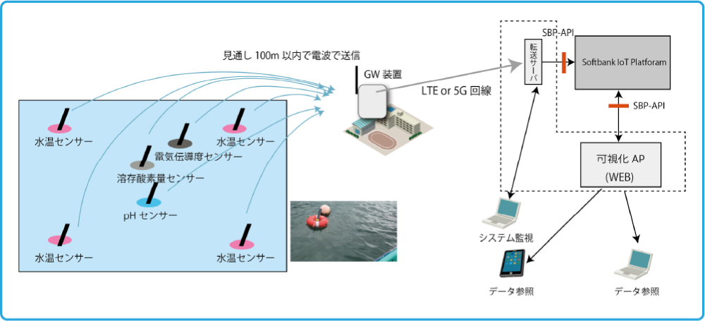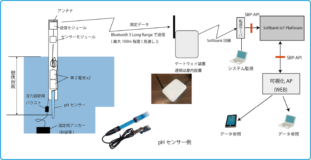 プラットフォーム機能 | 各センサーのリアルタイム数値の取得 各センサー数値データの蓄積 監視カメラ静止画データの蓄積 アラート機能 ・水温:5℃以下 26℃以上で発発報 ・PH:6以下 9以上で発報 (淡水域は pH6.7~7.5、海域は pH7.8~8.4 ただし、光合成により野外水槽は正午にかけて10程度まで上がる ) ・溶存酸素:4.5mg/l未満 上限なし ・電気伝導度:なし |