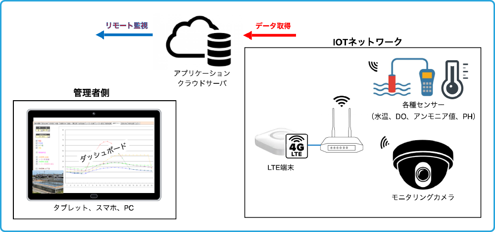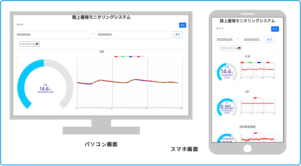 ダッシュボード機能 | 水温、PH、溶存酸素、電気伝導度数値のリアルタイム表示 水温、PH、溶存酸素、電気伝導度数値の推移グラフ表示 監視カメラ静止画像の表示 |